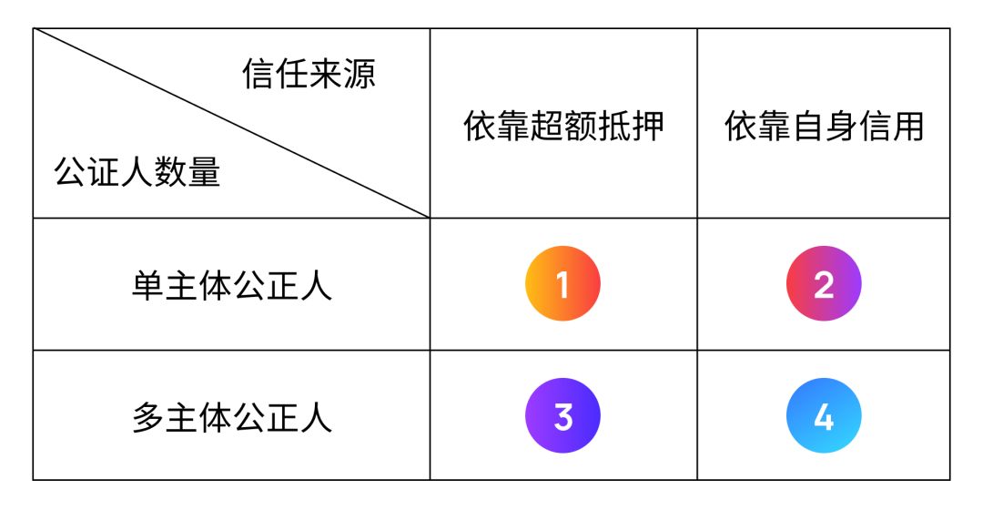 根据公证人的单主体还是多主体,以及公证人的信誉来源是超额抵押还是自身信用,我们可以把公证人方案划分为 4 个子类: