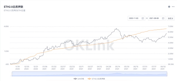 显然,ETH的销毁效应一定程度提振了投资者的信心。而根据欧科云链的数据,截至8月8日,ETH 2.0存款合约总质押数达到658.79万枚,这一数据长期以来一直在持续增长,如果再算上这部分「锁仓」的ETH,那么在ETH 2.0正式落地前,ETH的市场流通量将不断减少。