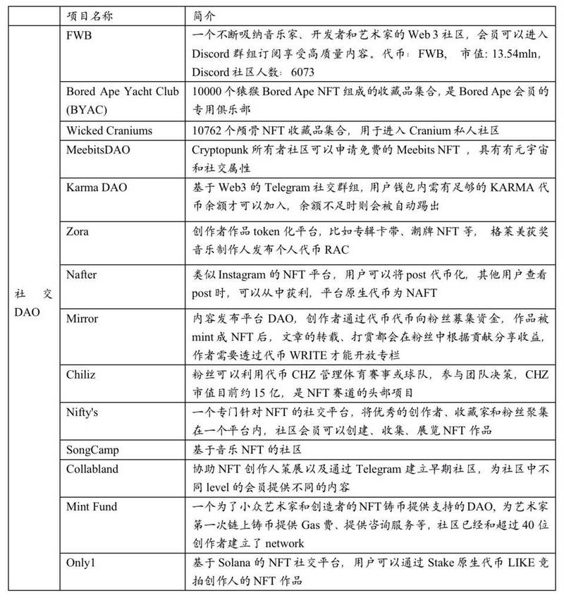 社交 DAO 是在 NFT 领域独有的一种社区组织形式,不同于 DeFi,NFT 代表着美术、音乐、视频、文学等现实爱好的上链,有共同爱好的人们往往有着社交和共享资源的需求,社交 DAO 便形成了,社交 DAO 也让人们开始意识到 crypto 世界不仅有金融价值,也有社交价值。下表我们总结了社交 DAO 的主要项目: