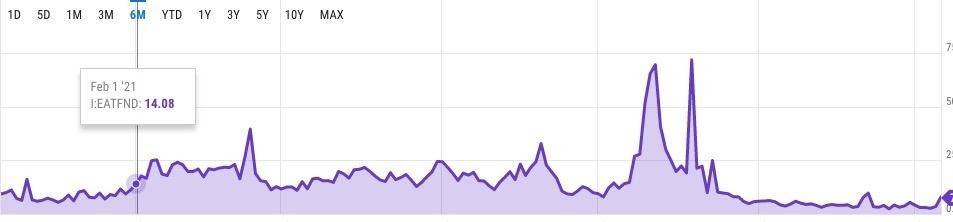 过去 6 个月间的 Gas 费变化,来源 :Ycharts