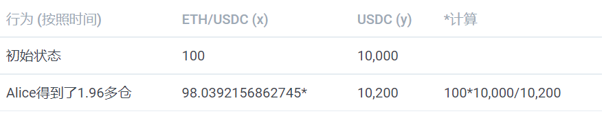 由于 Alice 注入 100U 并且两倍开多后,池子将头寸计入 Y 变为 10000+100*2=10200U,ETH 和 USDC 的汇率变为 100*10000/10200=98.04;Alice 实际 ETH 仓位变为 100-98.04=1.96;