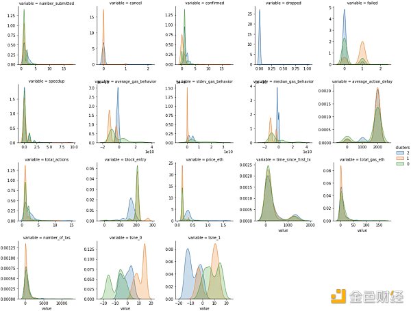 在查看了每个变量的子分布和一些数据示例后,我能够对集群进行分类。 Orange 集群是速度最快的组,同时平均提交的 gas 交易也略低。 Blue 和 Green 集群彼此表现出相似的行为,但 Blue 中的地址通常比 Green 集群中的地址具有更少的历史记录。