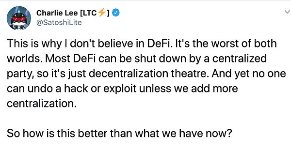 莱特币创始人李启威在推特上表示,这就是我不相信DeFi的原因。这是两个世界中最糟糕的。大多数DeFi可以被一个中心化的部门关闭,所以它只是一个去中心化的“戏院”。然而,除非我们增加更多的中心化,否则没有人能够撤销黑客攻击或漏洞利用。