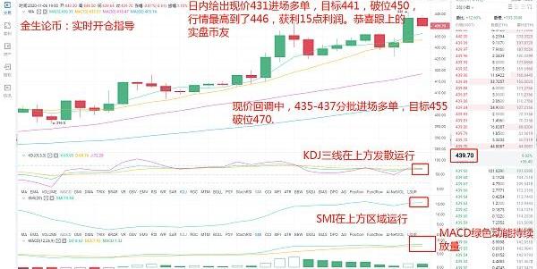 恭喜跟上金生论币实盘布局多单操作的币友们,日内给出431现价多单进场,目标441,破位450,行情最高走到了446,走出了15个点的利润。实力可鉴。策略全网公开,可查检。行情多变,市场没有永远的多头与空头,每个单子都有应变的方法。