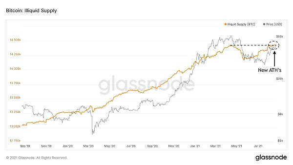 当前交易所剩余比特币数量占全部已流通比特币数量的比率,已下降至12.99%,已处于2021年1月2日的最低点,并且这一趋势自5月中旬之后持续加强,反映当前交易所中留存的比特币越来越少,交易所中的比特币是市场流通盘的主要构成部分,交易所中比特币占比越来越少表明市场中可供买卖的比特币逐渐减少,造成持续的供应冲击(Supply Shock),在需求不断增强,流通盘供应不断下降的情况下,对比特币的基本面将起到非常强的利好作用,长期看将促进比特币价上行。