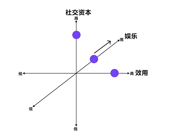 Eugene Wei从三个维度评估社交网络的实力:社交资本、娱乐和效用。这里我们可以简化一下,只看社交资本和效用这两个轴。