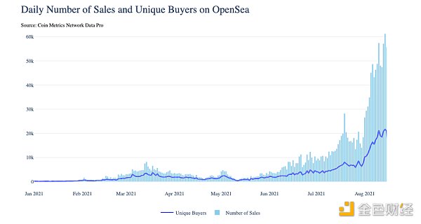 在过去两周,NFT的销售量激增,远远超过了3月份的NFT热潮。最大的NFT市场OpenSea的交易笔数在上周达到每天超过6万的峰值,接近3月份峰值的8倍。OpenSea的交易量在8月份已经突破了10 亿美元,每日独立买家的数量也创下了历史新高。