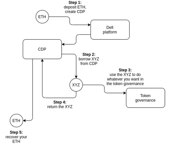 最简单的例子是从 defi 借贷平台(例如 Compound)借款。已经持有 ETH 的人可以将他们的 ETH 锁定在这些平台之一的 CDP(“抵押债务头寸”)中,一旦他们这样做,CDP 合约允许他们借入 一定数量的XYZ ,例如。他们投入的 ETH 的一半价值。然后他们可以用这个 XYZ 做任何他们想做的事情。为了收回他们的 ETH,他们最终需要偿还他们借来的 XYZ 加上利息。