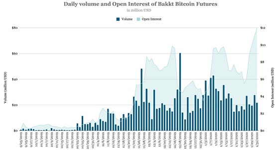 自9月下旬开盘以来,Bakkt一直吸引着更多的成交量。未平仓合约在1月底达到1,200万美元的历史高点。Bakkt在1月份的日均交易量达到2,645万美元,高于12月的2,155万美元。