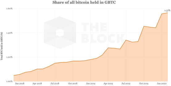 总体来看,在2017年、2018年和2019年分别有6400万美元、2.2亿美元和4.38亿美元流入GBTC。不过,Grayscale曾表示第二季度和第三季度分别有71%和近80%是非现金资金流入。这意味着投资者可以将自己持有的BTC存入以换取GBTC股份。