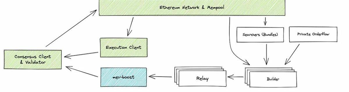 另一方面,验证者是这种情形的主要受益者之一。事实上,权力越大,利润越大:因为验证者拥有决定运行哪些交易的权力,他们可以通过确定哪些交易给他们带来最多的现金来获得“排序优化”费用。然而,在实践中,让验证者完成整个MEV搜索、打包和执行流程太过繁琐。因此,大部分的“排序优化”被外包给了专门的搜索者、构建者和中继器,这些中介可以想象成是验证者的“秘书”,他们为了获得一部分利润而简化了MEV的过程。具体而言,搜索者将寻找MEV机会,构建者将这些机会捆绑成完整的“块”,中继器将这些完整的“块”发送给验证者或实际的块构建者。因此,现代MEV生态系统的总体情况如下: