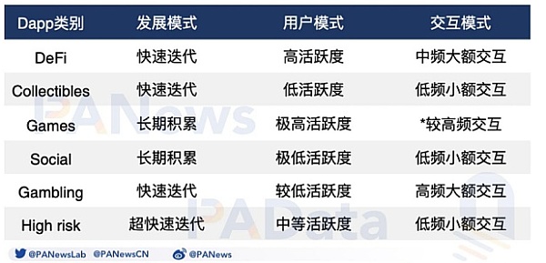 类DApp的基本特征是产品迭代快,用户总体活跃度较低,用户多为高频大额交互,但多款类应用的日活走势相对平稳。高风险类DApp的基本特征是产品超快速迭代,但用户活跃度中等,多为低频小额交互。