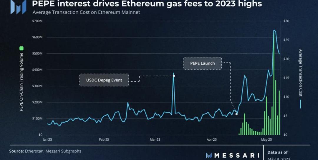 PEPE?引发了?Meme?币的复兴。因此,以太坊和比特币网络都出现了拥堵和交易费用上升的情况;