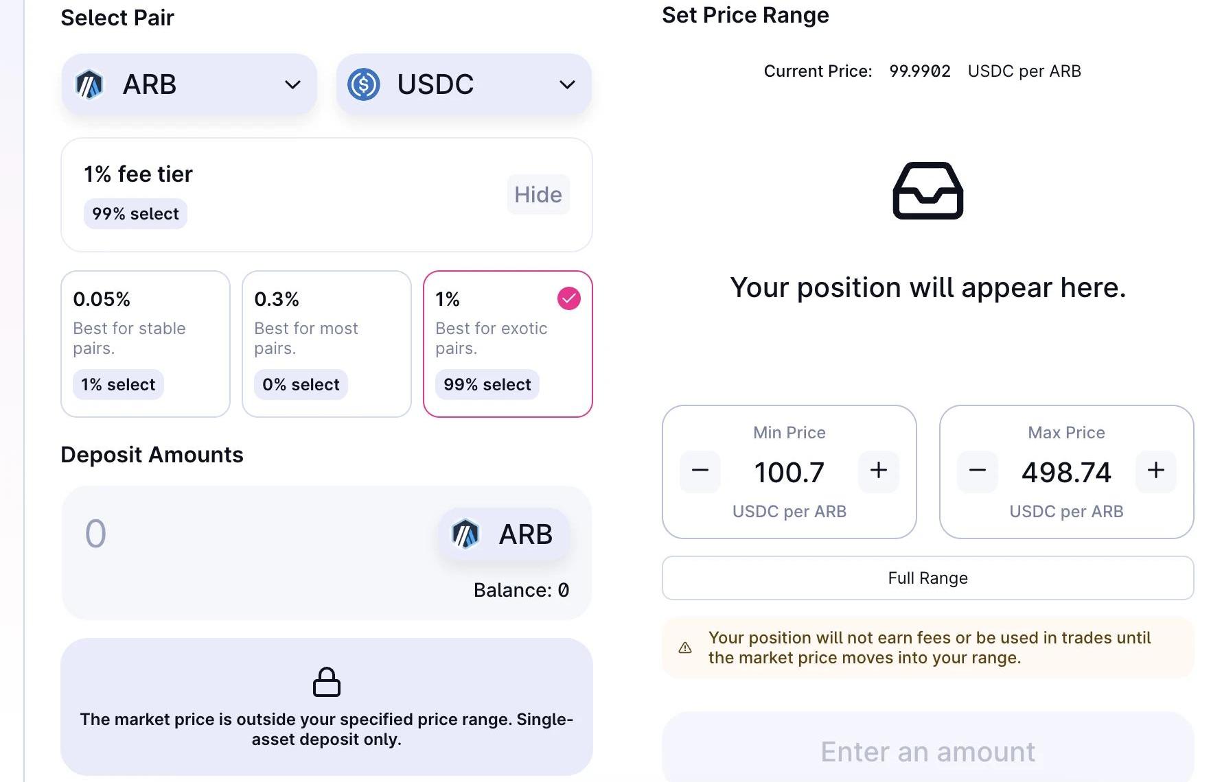 例如,将?ARB/USDC?做市区间设置为每?ARB?可兑换0.97?~?1.99USDC?之间,则当市场价格进入这一区间内时,我们即可向市场提供流动性并赚取费用。