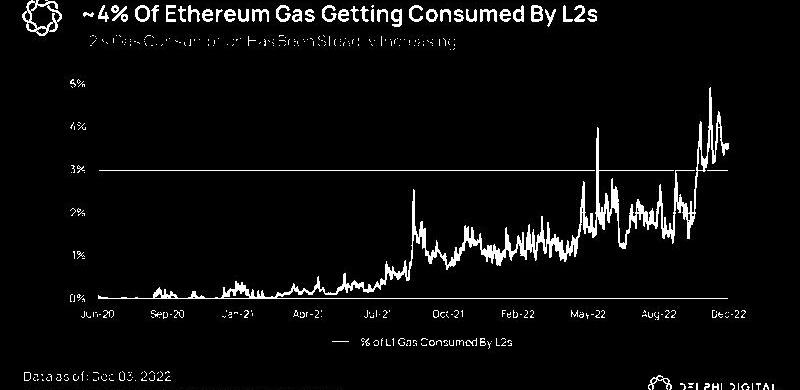 在过去的一年里,L2在以太坊上的采用情况令人印象深刻。他们在L1Gas消耗中的份额已经从年初的不到1%增加到4%。
