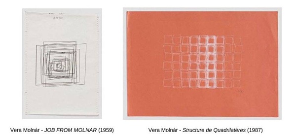 后来,第一批在艺术中使用电脑的艺术家之一 Vera Molnár 开始摆弄起「无序(disorder)」的主题,她经常研究几何形状和线条的变化。她的作品是用早期的编程语言 Fortran 和 BASIC 生成的,并经常被展示在原始的印刷纸上,她甚至选择把本子每一页的穿孔边缘的图形都包括到她的创作作品中。