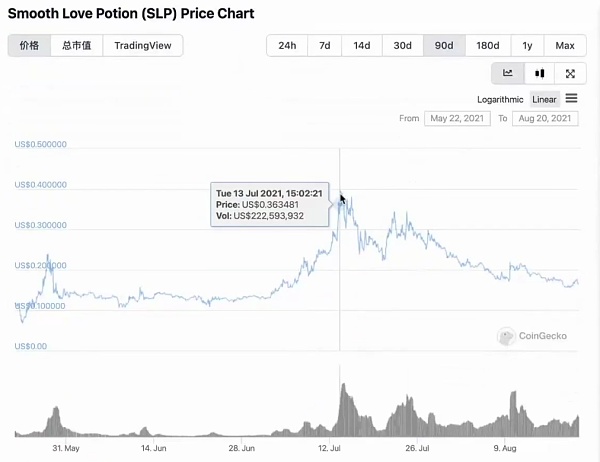 这里还涉及一个Axie Infinity的代币经济问题。5-7月是这一游戏的高速发展期,大量新增用户和资本涌入Axie Infinity,这时SLP和AXS迎来双涨,SLP在7月一个月内增发了十倍。这个阶段很多人预测SLP可能要下跌,但实际上,这个阶段SLP也在缓慢增长,而代币超发导致通货膨胀量也在增长。这时有些玩家可能会因为回本周期太长,把SLP换成以太坊或是美元,这将导致SLP的价格大幅下跌,同时又伴随着通货膨胀。从7月到8月,SLP的超发已经超过10倍,面临崩盘风险,这对玩家和资本方也不友好。所以,8月9日,项目方调整了SLP的通胀机制,直接减半。此后,SLP的通胀率便降下来了,同时,代币消耗机制还在运行。