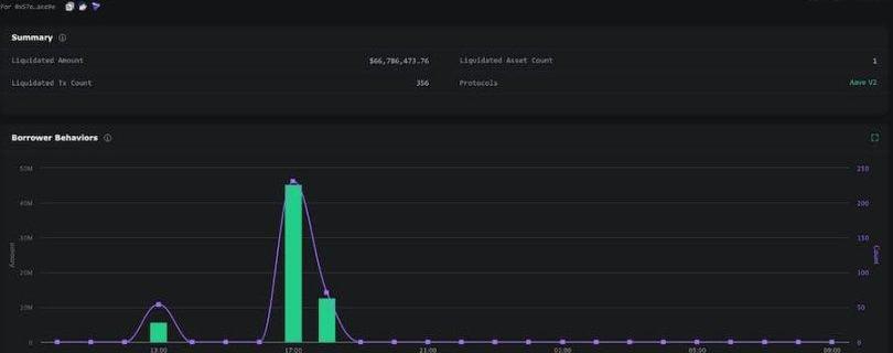 11月23日1:15至2:30左右,CRV短时冲高触及0.74USDT,随后又快速回落至0.6USDT一下。受价格波动影响,1:22至2:10之间,该地址被清算近5800万美元。