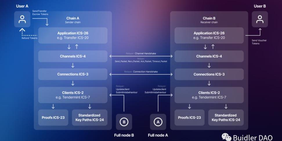 在IBC中,区块链彼此间不会通过网络直接互相传递消息,而是依赖中继器进行通信。中继器是链下进程,负责监视运行IBC协议的每条链的状态,并将更新的数据包中继给交易对手链。如上一段的例子,当A向B发送消息X,A会在其状态机中提交或存储包含消息X的数据包的哈希值。当中继器看到A在状态机中提交了一条打算发送给B的消息X时,他们只需要拿起这条消息X并将其传递给B。