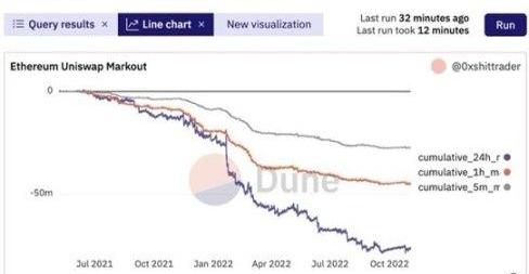 Uniswap的团队声称,我在分析中没有计算费用,UniswapETH/USDC池子自成立以来实际盈利1.5亿美元。差异如此巨大。