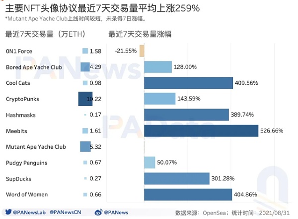 2) NFT头像8月的交易量环比增幅远高于交易次数环比增幅,这或意味着近期NFT头像交易火爆的主要动力来自于成交价攀升,其中还受到ETH持续上涨的影响。4个热门头像协议8月的成交价环比普涨超400%。