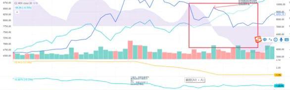 在比较BTC价格与NDX100指数关系时,我们采用了CC指标。紫色区域在水平线上越大,代表二者正相关性越大;在水平线下越大,表示二者的负相关性越大;越接近水平线,二者相关性越小。