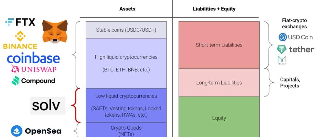 第三,帮助发现创新机会和梳理业务战略。资产负债表所提供的资产洞察,有时可以帮我们发现市场的空白点和潜在机会。Solv就是这样一个例子。Solv作为支持用户自定义多维资产的平台,远期目标清晰,但业务切入点的选择十分不易。我们在进行战略思考的时候,制作了下面这样一张全行业资产负债表,看到了低流动性资产的空白机会,因此决定从这个领域切入,取得了良好的效果。