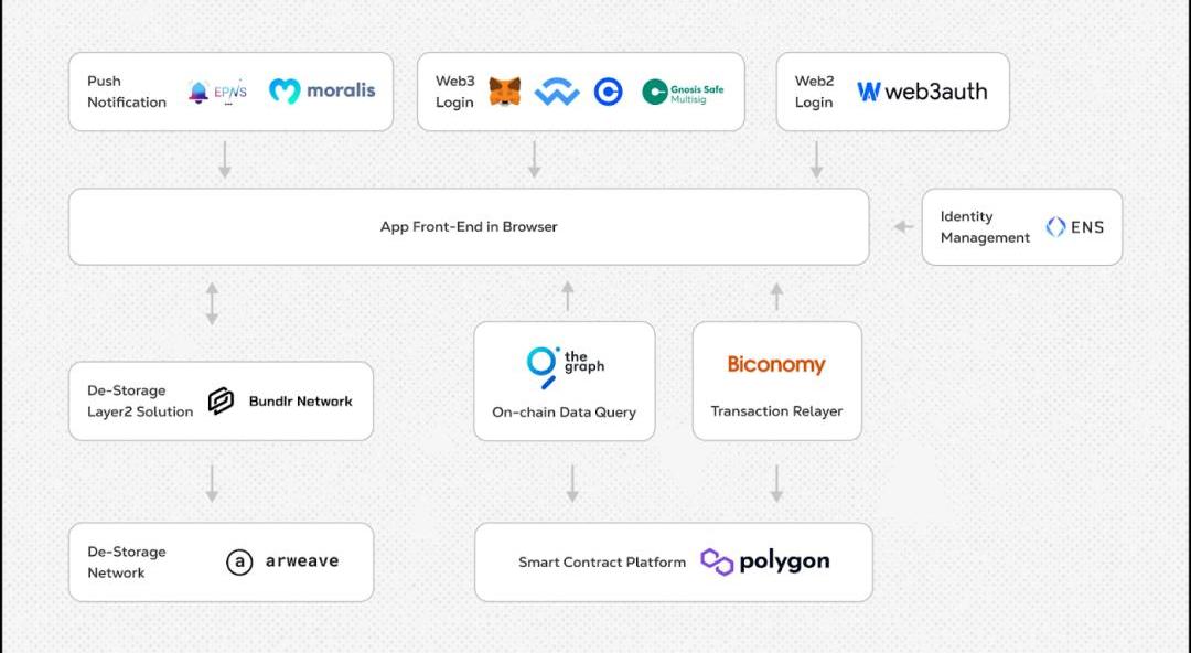 首先,dDApp在去中心化的智能合约网络上运行其后端,而不是中心化的服务器。前端是用户界面,它根据用户的操作来调用后端。用户通过他们的钱包或社交媒体登录到我们的前端;我们使用ENS允许用户将身份映射到地址。用户可以用他们的私钥签署文件,以捕获意图和同意,并且签名和相关的元数据被存储在Polygon和Arweave的链上。