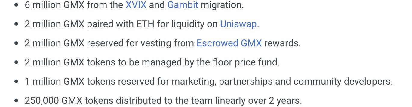 GMX已推出效用和治理代币GMX,预计最大供应量为1325万个GMX代币。其中,从XVIX和Gambit迁移过来的有600万枚,200万枚用作GMX质押的?EscrowedGMX奖励,200万枚由底价基金管理,100万枚用作营销、合作关系以及社区开发者,分配给团队的有25万枚,这部分代币分两年线性释放。