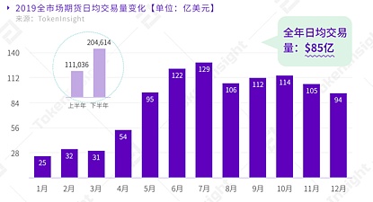 随着减半行情的到来,数字资产市场也开始活跃起来。尤其是以交割合约为主的衍生品市场也迎来了持续繁荣。机构统计,2019年全球合约交易量超过3万亿美元,日均85亿美元;而今年数字资产衍生品市场规模预计将会在去年的基础上翻倍。