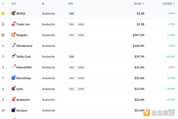 Avalanche链上DeFi锁定资产前十排名及锁仓量,数据来源:Debank