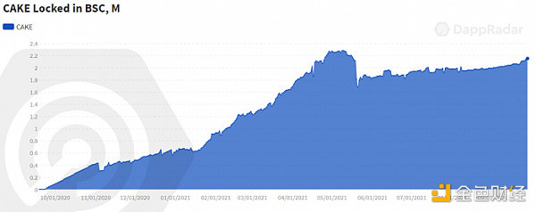 如果要对 BSC 的 DeFi 状态进行分析,就不得不提PancakeSwap(CAKE),目前 PancakeSwap 的 锁仓量约为 92.2 亿美元,占到 BSC 网络总锁仓量的 42%。下图展示了 CAKE 供应量的增长,表明 PancakeSwap 占据了 BSC 网络上的大部分价值,类似于 WETH 在以太坊中的情况。