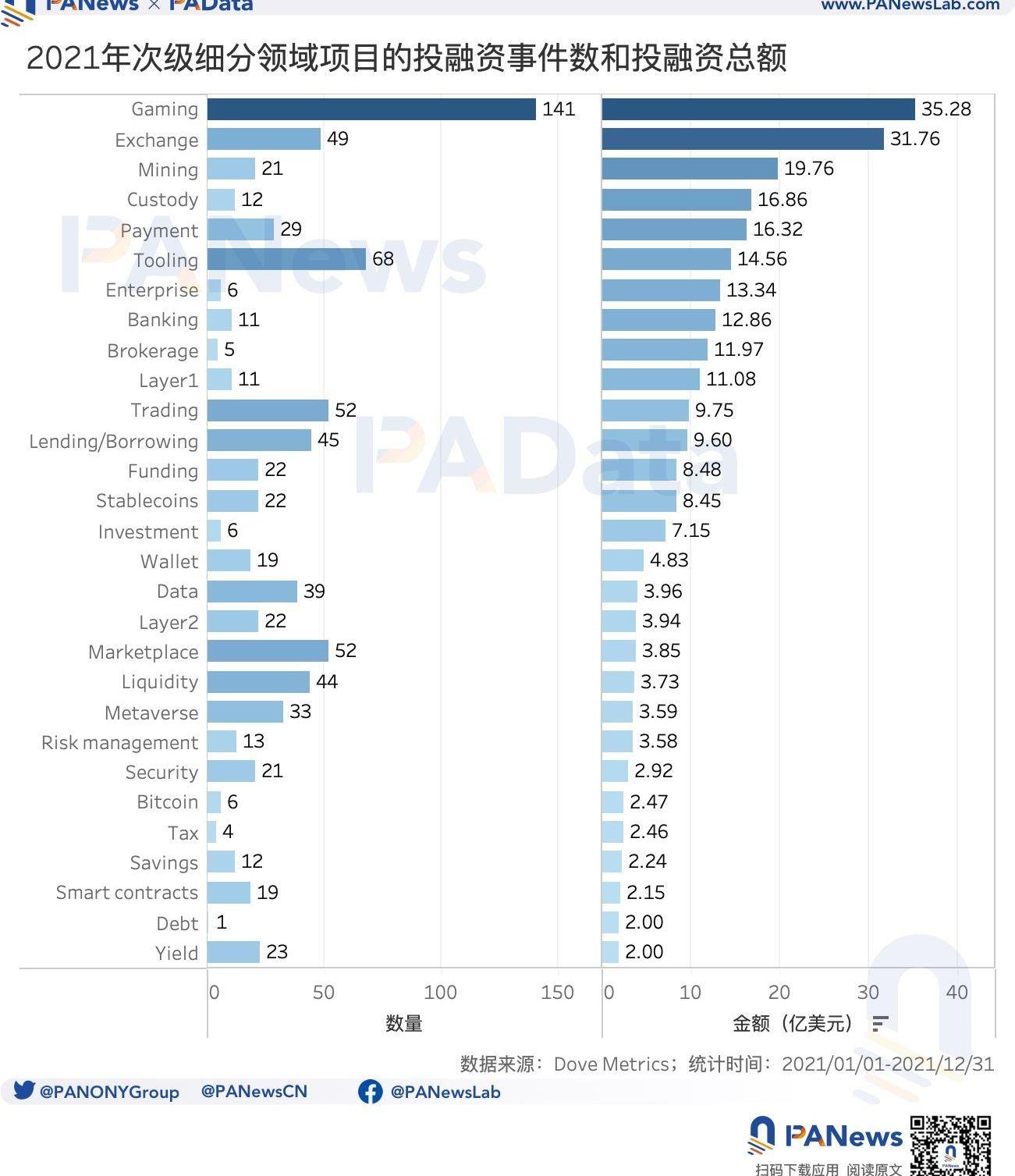 从主要的次级细分领域来看,Gaming共披露了141起投融资事件,累计总额达到35.28亿美元,这两个数据都居所有次级细分领域之首,毫无疑问是2021年最受资本青睐的。这些Gaming项目大多与NFTs相关联,部分与Web3相关联。