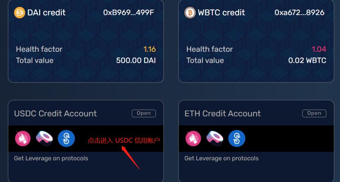 理论上,每个用户可以启用多个信用账户,不过目前仅支持?DAI\USDC\ETH\WBTC?四种资产类型,这里我们以?USDC?信用账户为例。