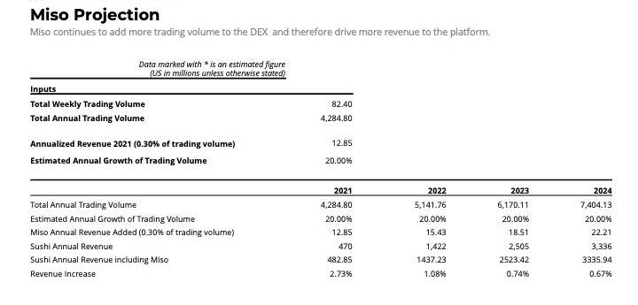 根据Rachel所说的每周交易量,我们计算了Miso将在2021年交付给DEX的年化交易量。从那里,我们假设Miso将以20%的年率继续向DEX增加更多的交易量。由于收取的收入是总交易量的0.30%,因此可以计算Miso贡献的收入。根据上述预测,Miso在2022年将能够产生超过51亿美元的交易额和1500万美元的年收入,即1.08%。
