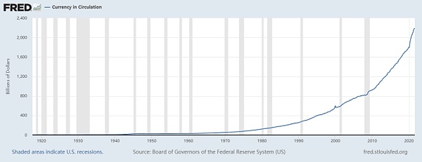 上图:截至2021年8月26日,流通中的美元总量约为 2 万亿美元。图源:美国联邦储备经济数据库 (FRED)