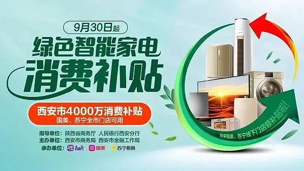 根据商务部进一步开展商务领域促消费重点工作的指示,为壮大绿色循环消费,积极扩大重点领域消费,促进消费增长,9月30日起,西安市商务局、西安市金融工作局联合品牌家电卖场在西安市范围内的经营门店,以及工商银行、农业银行、建设银行、交通银行、邮政储蓄5家数字人民币试点银行陕西省分行,举办绿色智能家电消费补贴活动。