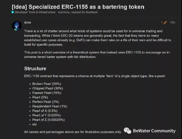 此外,他又提出了 ERC-1155,一个以物换物的 token,因为他认为 Loot 宇宙必须要有一个交易的冷媒介。可以看到他有一个非常宏观、高瞻远瞩的设想,他会看到一个宏观的宇宙需要什么样的骨架,然后就去提案号召社区一起创造,所以他像是一个非常宏观的架构师。