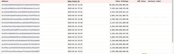 由于SmartMoney的数量不同,展示结果将与平时情况有所出入。使用:NansenTokenGodModeTokenDawgmodeDune仪表盘TokenAnalyzooorDune仪表盘当你查看首批买入PEPE的钱包时,会发现有些奇怪。许多钱包在20秒内以极低的价格同时买入,超70T。