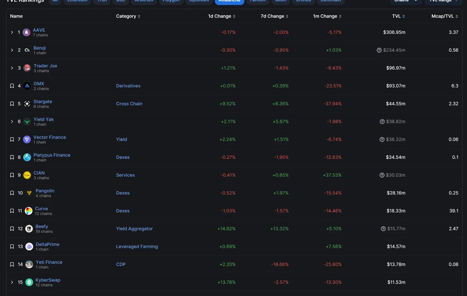 但Avanlanche的DeFi发展较好,抛去$635.75m的Wonderland,TVL也接近$830.91m,各种DeFi产品都可以在Avanlanche找到。Avalance的DeFi竞争格局有一个独特点:Top15的DeFi中AAVE,Curve,Beefy这些是迁入者,其中AAVE直接拿走36.95%得市场份额,原生借贷Bneqi发展了多业务规模也才不到AAVE的80%,而自有生态的GMX,Stargate选择多链发展,在其他链混的也风生水起,比如GMX,直接在Arbitrum上当老大,份额占32.96%。且TVL100M以下,断层式发展,GMX和Stargate之间TVL相差一半还多。