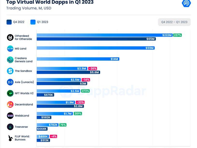 其中,OtherdeedforOtherside是第一季度交易量最高的虚拟世界应用,其交易量高达2.22亿美元,环比增长237.34%,销售额达65,399笔,创历史新高,环比增长138.80%。此外,于今年年初推出的MGLand表现出众,其交易量近6000万美元,销售额达到45,219笔。在MGLand中,用户可在每个MG地块上构建一个拥有独立域名的去中心化空间,NFT用户可以在此自由结识新朋友、社交、玩游戏及进行各种活动。值得一提的是,MGLand之所以出现高交易量,主要是部分NFT巨鲸将之用于Blur的刷分操作,以在BLUR下一期空投获得更多代币。