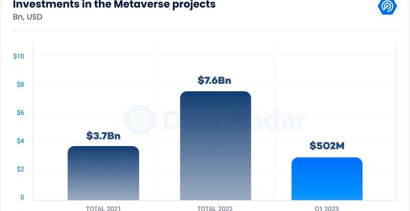 在过去的几年里,区块链游戏和元宇宙项目一直在吸引大量投资,并在2021年获得了37亿美元的投资。在2022年,该行业继续保持上升趋势,全年共筹集到76亿美元的资金。进入2023年第一季度,该行业表现良好,总计有5.02亿美元投入到区块链游戏和元宇宙项目。