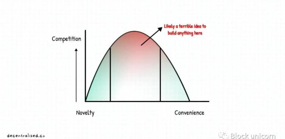你最终希望你花费时间、金钱或精力的东西能够在没有积极管理的情况下成长。而要做到这一点的唯一方法是,一个产品能够做到两点:首先,也是最重要的一点,留住他们已经拥有的用户;其次,积极扩张,使竞争者无法蚕食其市场份额,你是如何做到这一点的?(当一个人不得不开始考虑护城河和保留用户的时候,你就知道这是一个熊市)竞争是为失败者准备的。能够解释这一现象的部分原因是将公司排在新奇和便利之间的光谱上。在早期,像NFT这样的原始产品是新奇的,吸引着人们不遗余力地去尝试产品。我们已经习惯了为钱包处理种子短语/助记词和处理入口,因为使用「数字货币」的新奇性足以引起我们的兴趣。注意到用户对Ordinals很感兴趣,你会意识到用户有多么有耐心。这些耐心的部分原因来自于早期利润因素,投机和盈利促使用户愿意经历各种坎坷。