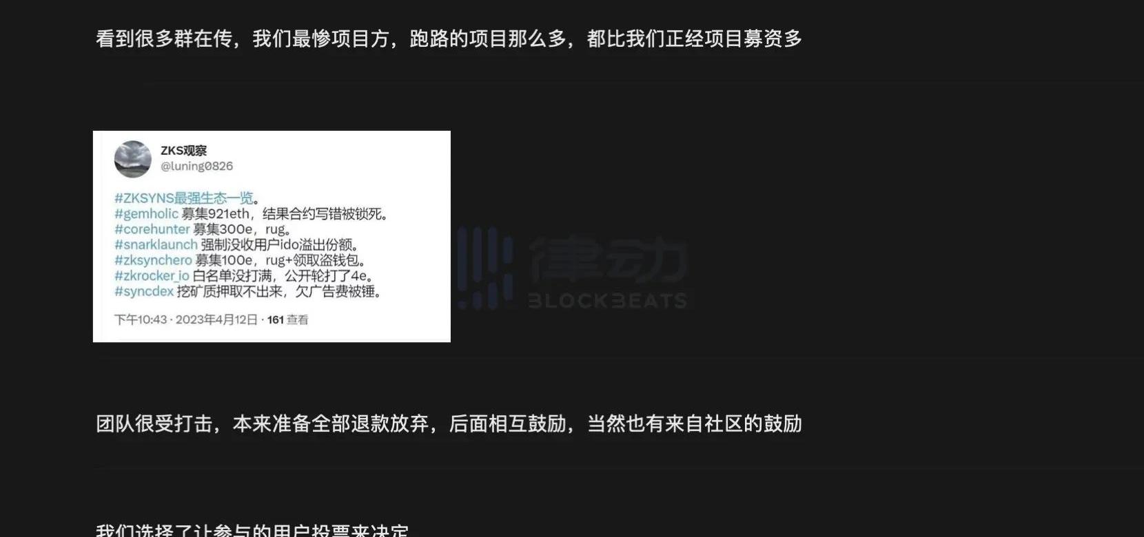 4月7日,Gemholic募资的921ETHID0资金因zkSyncEra不兼容转账功能而卡在智能合约中。zkSyncEra官方随即表示,将会协助追回资金,之后发布声明称已找到一个解决方案来解冻合约。接着Gemholic表示,解冻后会让社区投票,决定之后是退回eth,还是开盘继续项目。而顶着「zkSync时代的第一个ve代币」的Velocore,在发售前就声称要通过将激励与质押结合起来,从而有效地解决了溢出销售的固有问题。因此社区一度火热,预售也在短短几分钟内就销售一空,超出预期1800%,累积了约8,600ETH,TVL暴增。然而,随着项目空投规则的分发,许多社区成员发现空投领取竟还需要线性解锁,都认为Velocore此举不体面,在空投发放时有反悔迹象,$VC的价格随之应声大跌。而此时的团队成员并没有做出危机处理,而是开了一个新的推特账号,准备推出新的ID0,社区成员心态再次崩了,大骂项目方此举已经是「司马昭之心路人皆知」,这个盘不行就准备再开一个盘圈人。多个项目先后跑路
