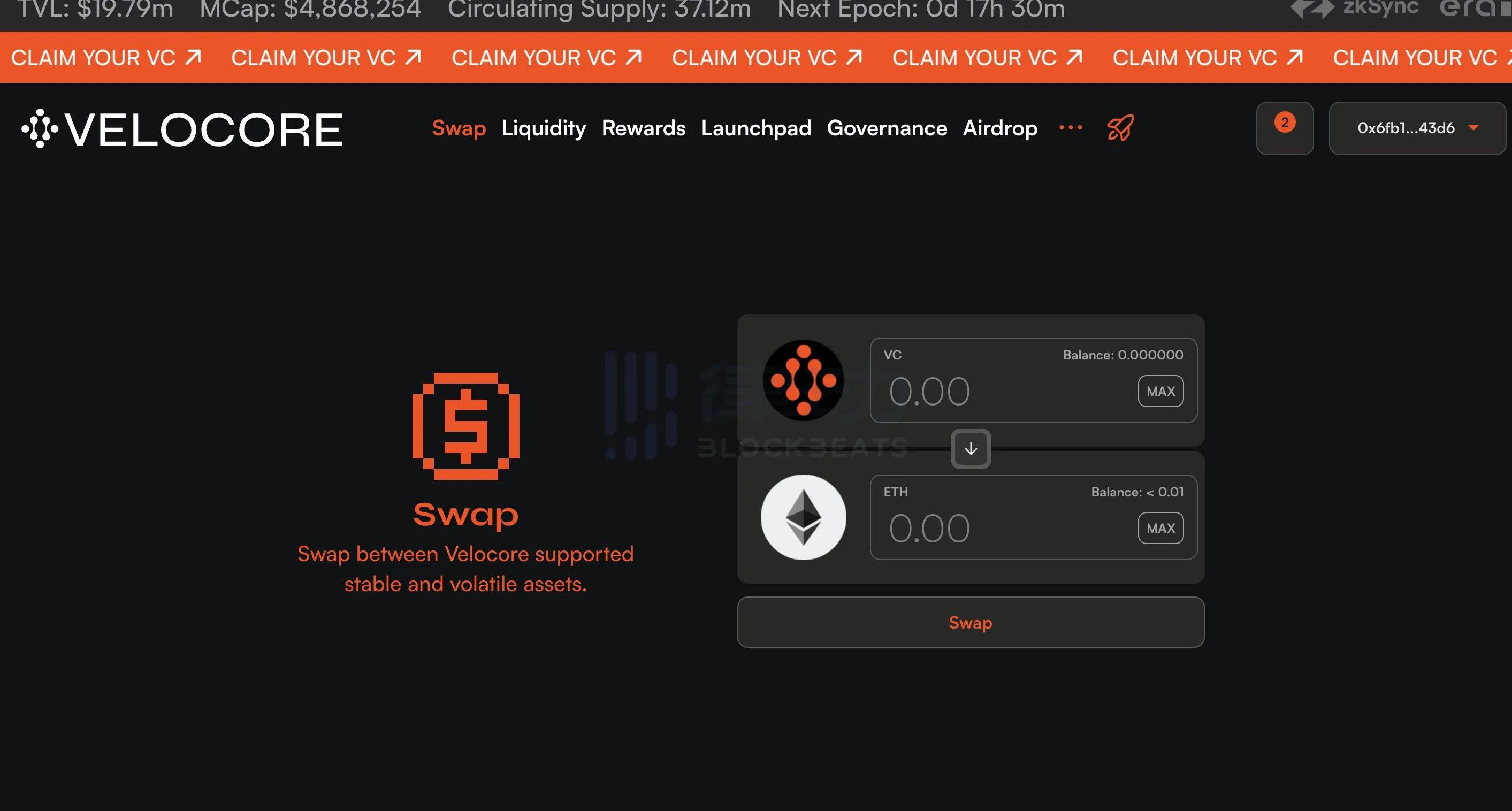 根据DefiLlama的数据显示,TVL约6176万美元。在界面上,简洁易操作,可以打出8分;Swap功能支持9种token;Gas消耗为1.94刀。再来看看Pool,可以发现流动性池的组成比较丰富,USDC/ETH、BUSD/USDC、ETH/OT等,需要注意的是,市场上支持OT的DEX仅此一家,这也是SyncSwap高TVL的原因之一;在社交媒体方面,SyncSwap有27万粉丝,但因空投事件,用户好感度有所下降。除了SyncSwap外,Velocore是zkSyncEra排名名第二的DEX,也正是我们在前文提到的因空投规则是线性解锁而价格大跌,团队开了新号准备开始其他IC0的项目方。Velocore是一个Solidly分叉DEX,基于Velodrome代码,旨在奖励提供流动性的用户,增强zkSyncEra的基础设施。TVL约2017万美元;界面不算简洁,6分;Swap功能仅支持7种token,Gas为2刀。Pool深度上,由于ve机制,流动性池相比SyncSwap低;社交媒体有1.1万粉丝,由于是3月分新建的社交媒体,这个数字还算不错。