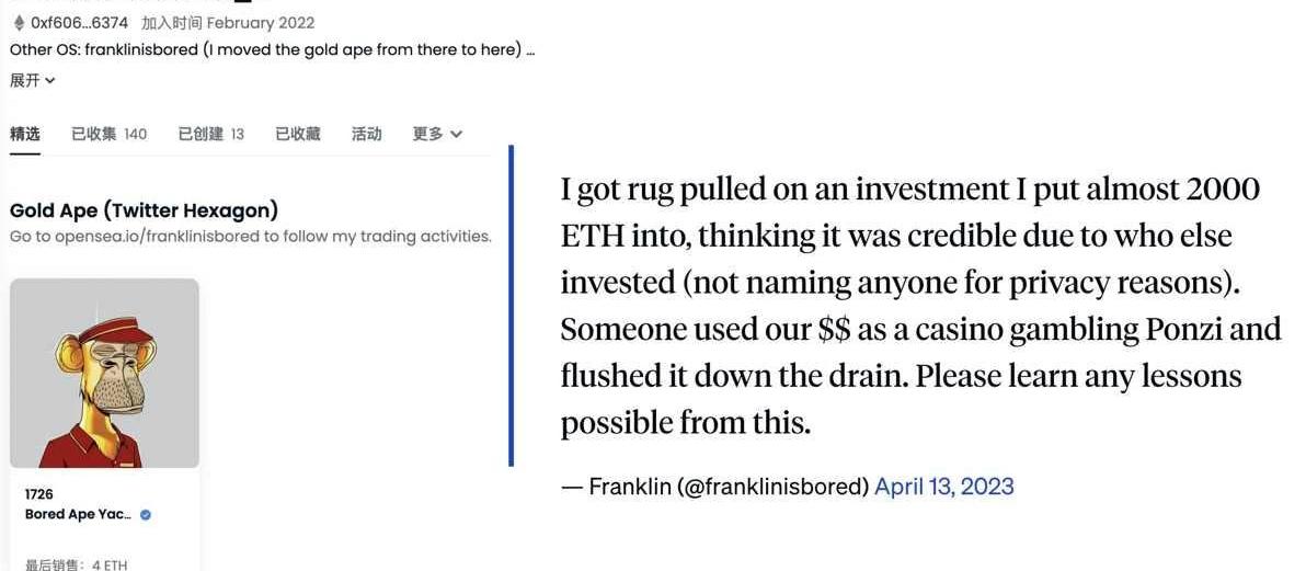 BAYC巨鲸@franklinisbored推特注销,一代传奇暂时落幕。