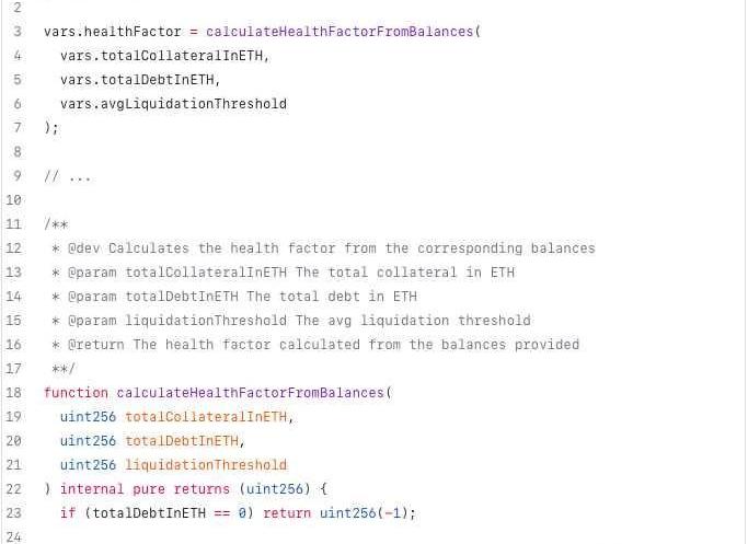 显然,当用户没有债务时,他们的头寸无法被清算,因此健康因子默认为type(uint256).max。否则,健康因子被定义为: