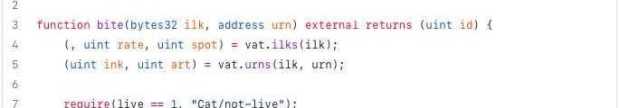 另一个设置清算不足抵押头寸阈值的协议是Maker。让我们检查该协议部署用于处理清算的两个合约:·Dog:在迁移到liquidations2.0之后部署的。此处的清算函数为bark()。·Cat:liquidations1.2,bite()。·grab():VAT合约,用作在部署猫合约之前进行清算的方法。让我们看一下bite()中的片段: