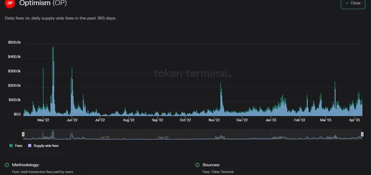 在L2之前,当以太坊变得拥堵时,交易费用会飙升。在2021年的某一时刻,一笔交易的费用甚至高达200美元。在采用周期中使用以太坊有点像在航班晚点后试图叫优步,需求太多,但供应却不足。L2正是为了解决这个问题。但是,当用户今天在Arbitrum上支付21美分手续费时究竟发生什么?Arbitrum收获了多少费用?验证者又有多少收益?当你在咖啡店购买三明治时,面包师傅获得了多少价值?应该给肉类生产商多少钱?给经销商多少钱?浇头和调味品多少钱?三明治有什么特别之处?什么带来了最大价值?其他一切都是补充吗?这是我们在L2和以太坊技术堆栈的经济学方面应该思考的问题。答案是,到2023年为止,用户在Arbitrum支付的费用中约有62%支付给了以太坊验证者。自2021年成立以来,所有费用中的64%已支付给以太坊验证者。与此同时,通过Optimism产生的80%的费用如今都归以太坊验证者所有。自2021年成立以来,所有费用的74%支付给了以太坊L1。下面是TokenTerminal提供的数据: