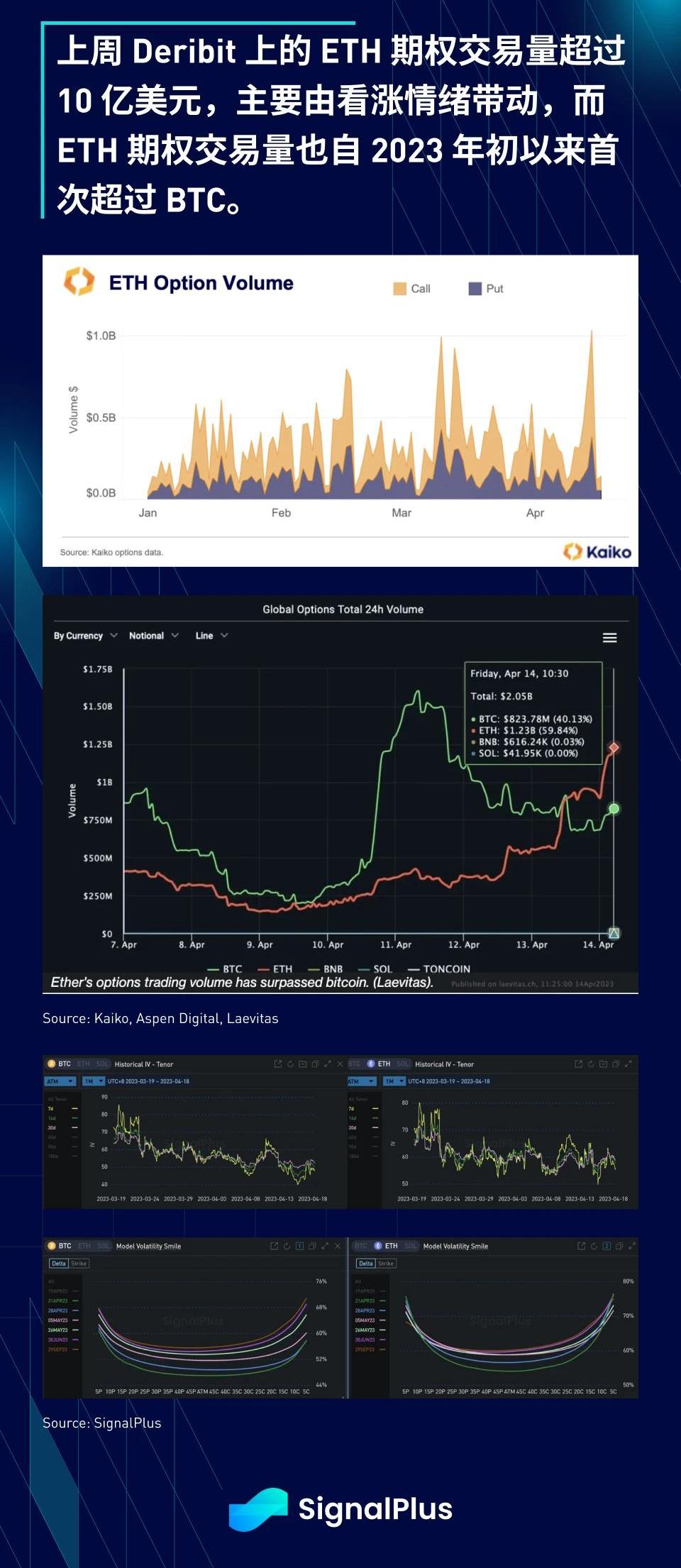 上周Deribit上的ETH期权交易量超过10亿美元,主要由看涨情绪带动,而ETH期权交易量也自2023年初以来首次超过BTC。然而,整体隐含波动率水平仍然低迷,因为在Shapella升级后主要是做空波动率,不过由于现货价格持续反弹,市场情绪也继续转向看涨,波动率偏斜继续向看涨方向调整。如果想即时收到我们的更新,欢迎关注我们的推特账号@SignalPlus_Web3,或者加入我们的微信群、Telegram群以及Discord社群,和更多朋友一起交流互动。SignalPlusOfficialWebsite:https://www.signalplus.com/